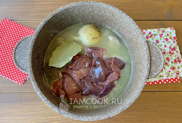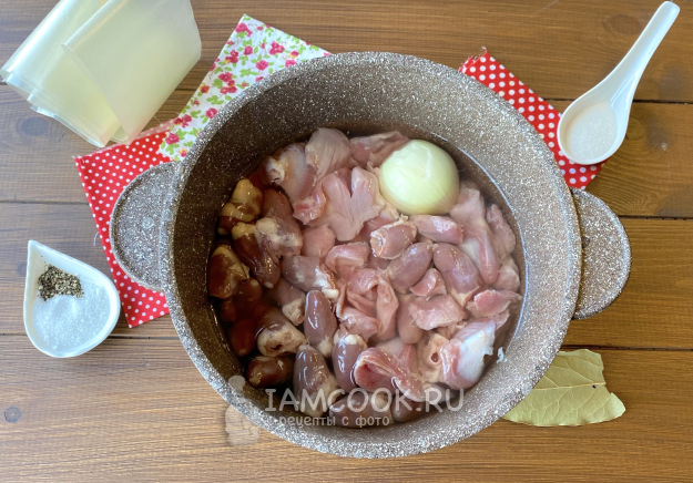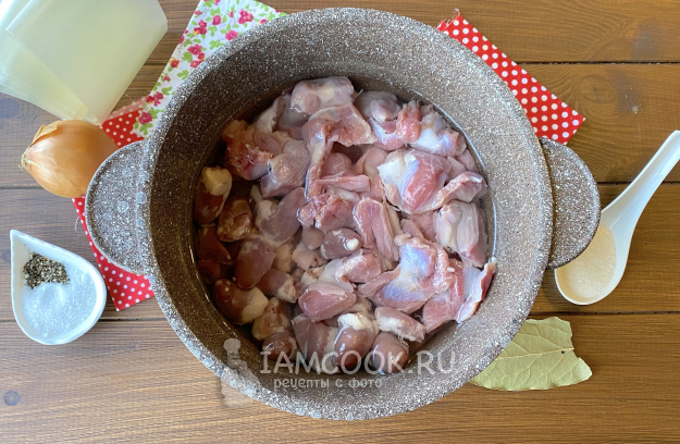 Для начала промойте субпродукты. В кастрюлю выложите желудки и сердечки, залейте холодной водой так, чтобы она полностью покрывала потроха.