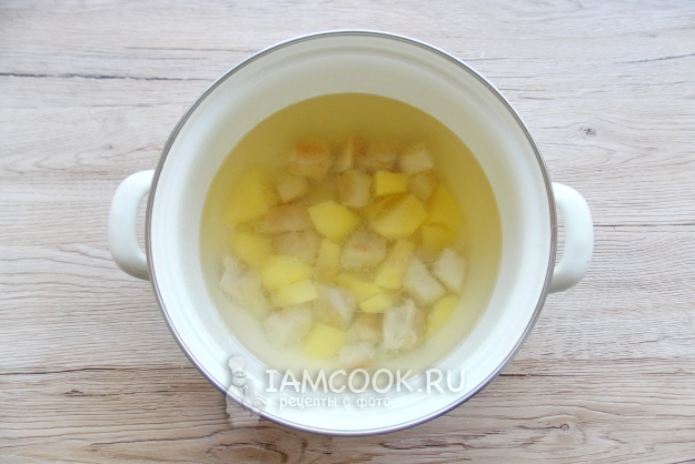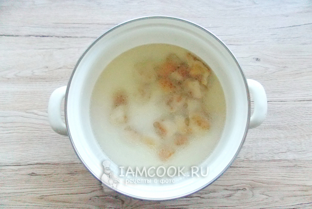 Варите свинину до полуготовности. Картофель очистите, помойте, нарежьте кубиками и добавьте в суп.