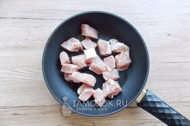Свинину помойте и нарежьте небольшими кусочками. Выложите в сковороду с подсолнечным маслом.
