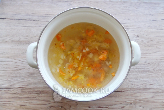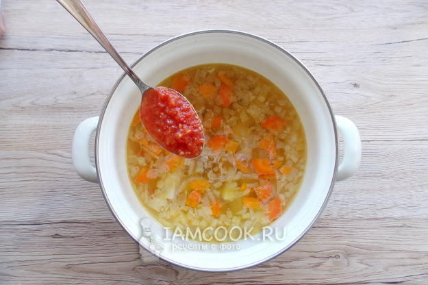 Выложите эти овощи в кастрюлю. Суп посолите, поперчите и варите до готовности свинины и овощей.