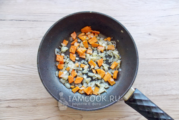 Морковь и лук очистите, помойте и нарежьте не крупно. Пассеруйте на сковороде с подсолнечным маслом до прозрачности лука.