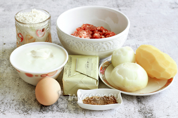 Для турецкой самсы подготовьте всё необходимое по списку. Вместо сметаны можно использовать густой кефир либо йогурт, или смесь того и другого. У меня густой кефир смешан со сметаной. Фарш тоже может быть любым по вашему вкусу, но турки не едят свинину. Сливочное масло до использования держите в холодильнике.