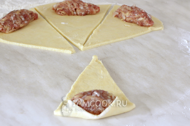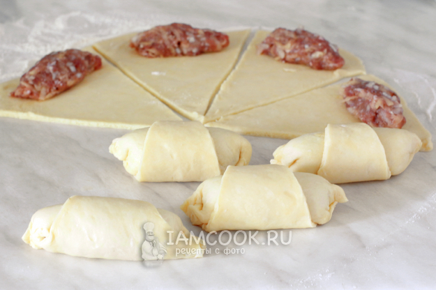 Распределите фарш на каждый сегмент и сформируйте рогалик, скрепляя кончики и закрывая боковые части.