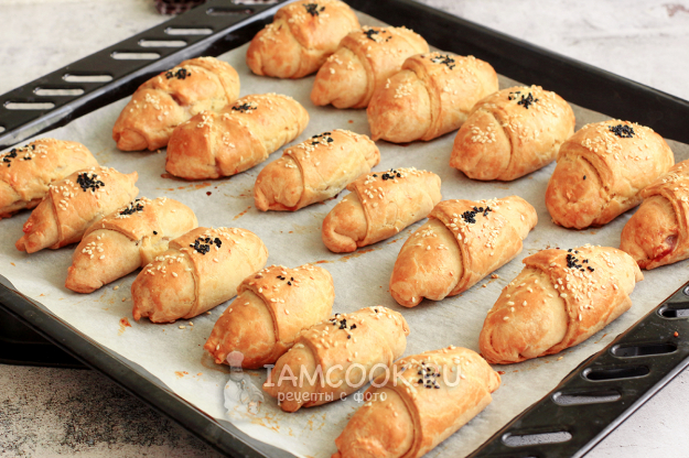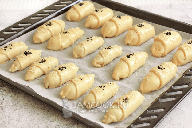 Получаются рогалики-круассаны. Они очень мягкие, как дрожжевые.