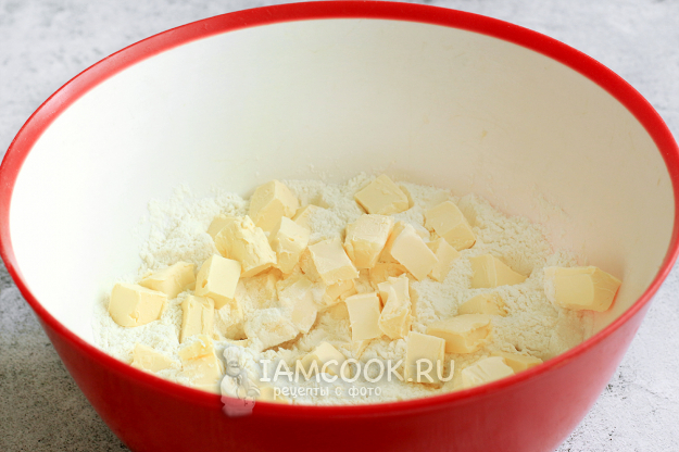 Муку смешайте с солью, сахаром и порубите в нее кусочки масла или маргарина. Перетрите все в мелкую крошку. Также можно натереть масло на крупной терке.