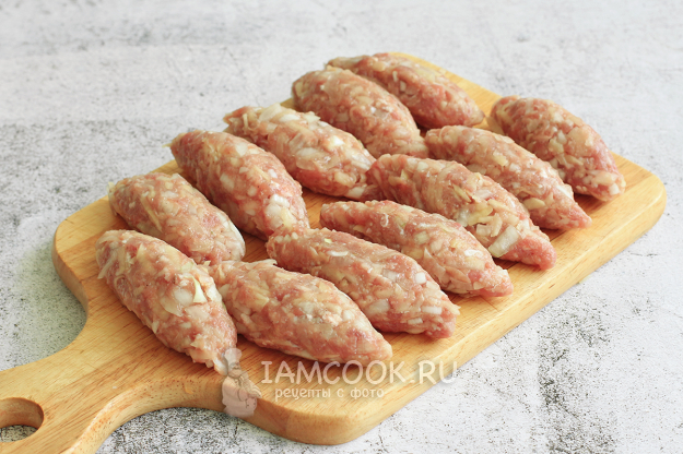 Сформируйте из фарша маленькие котлетки, не длиннее 4 см. Мне потом пришлось их уменьшать, получились большими.