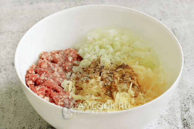 Для начинки соедините фарш, мелко нарезанный лук, натертый на крупной терке картофель. Если образуется много сока в картофеле, то отожмите его. Добавьте соль и все специи, хорошенько перемешайте рукой, раздавливая лук, чтобы он отдал свой сок фаршу.