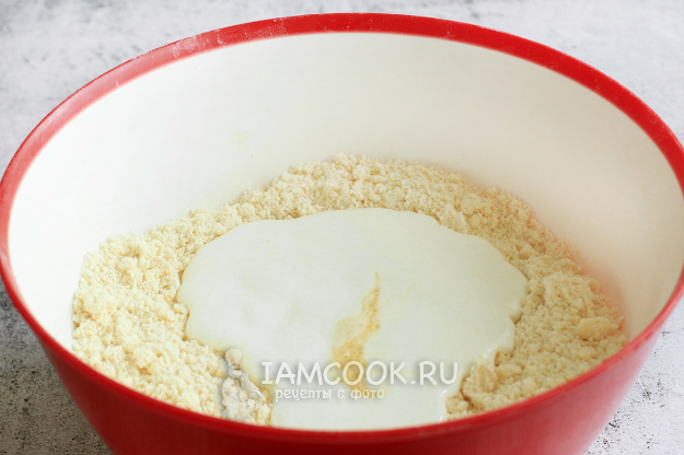 Соду соедините со сметанно-кефирной смесью. В центре мучной крошки сделайте лунку и влейте туда кефир со сметаной и половинку яйца. У меня было крупное яйцо и я его разделила пополам, половину - в тесто, а вторую половину оставила для смазки самсы. Мелкие яйца добавляйте целиком.