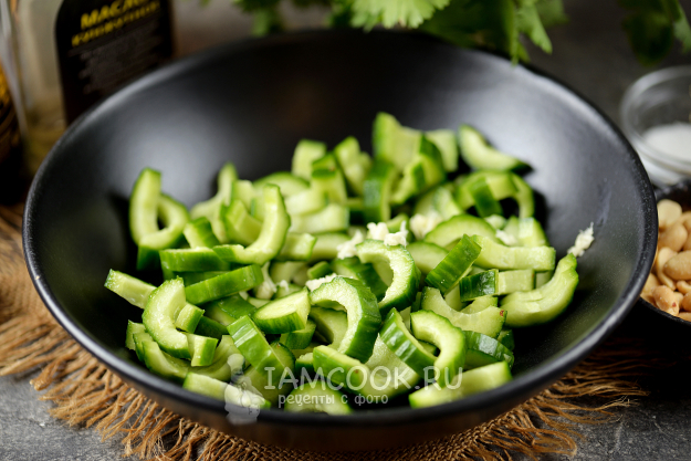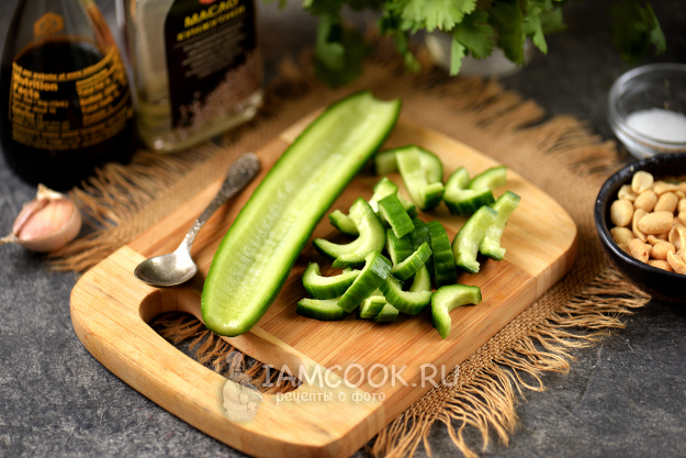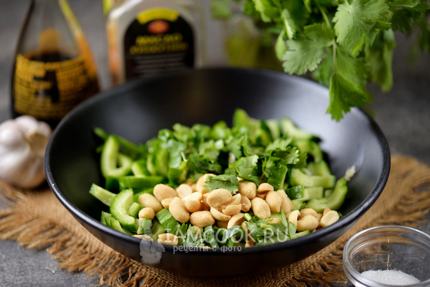 Подготовьте все необходимые продукты для китайского салата с арахисом и огурцами. Чеснок почистите, помойте с огурцами и кинзой под проточной водой, обсушите. Арахис можно использовать жареный, с солью.