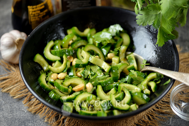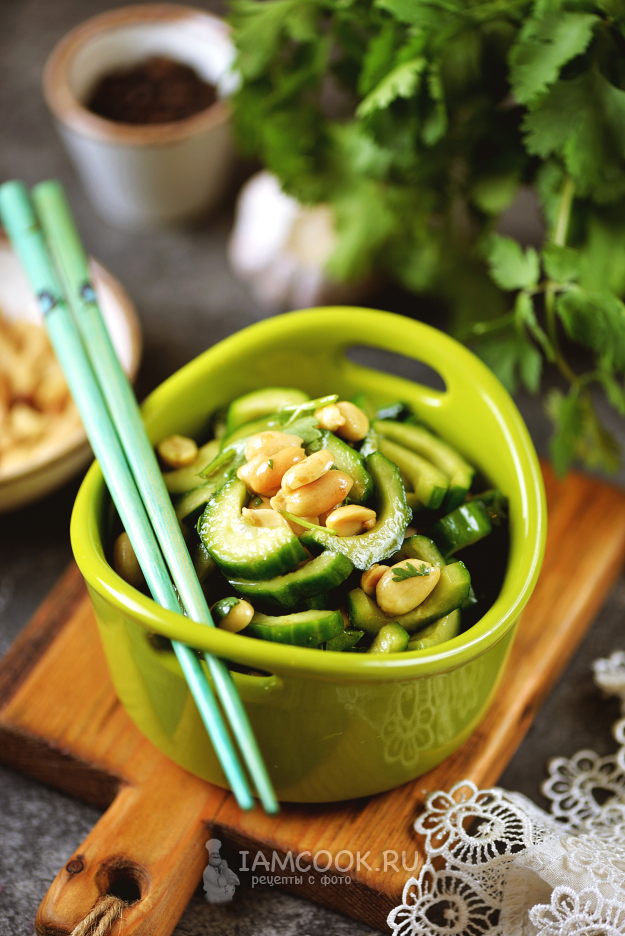 Готовый китайский салат с арахисом и огурцом разложите по порциям и подавайте в качестве закуски к любому мясу - запеченному, вареному или жареному.