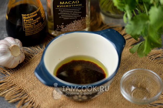 В пиалочке взбейте масло, уксус, соевый соус и сахар до однородного состояния.