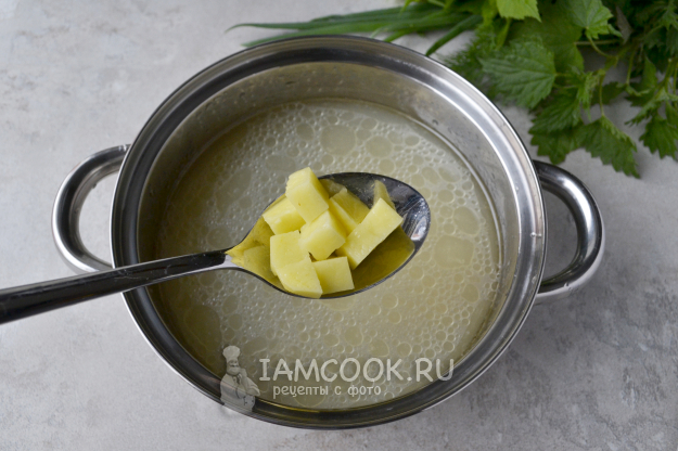 В кипящий бульон опустите очищенный и не крупно нарезанный картофель. Варите до готовности картофеля.