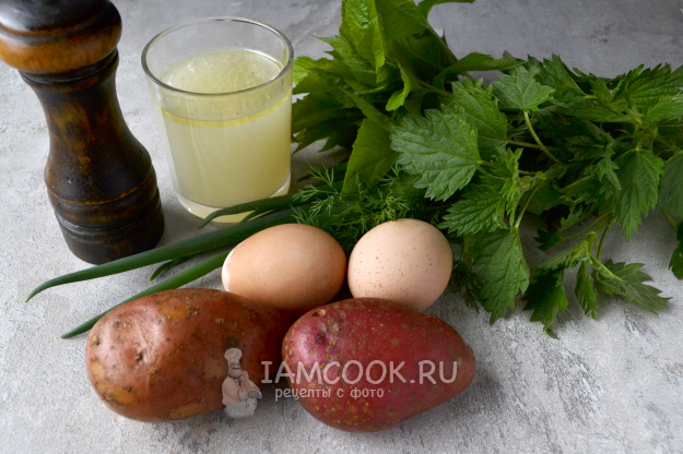 Возьмите продукты для приготовления супа из сныти и крапивы с яйцом. По желанию можете взять любую зелень, которой отдаете предпочтение. Это может быть щавель, любисток, петрушка и т.д. Крапиву и сныть собирайте на своем приусадебном участке или вдали от автомобильных дорог.