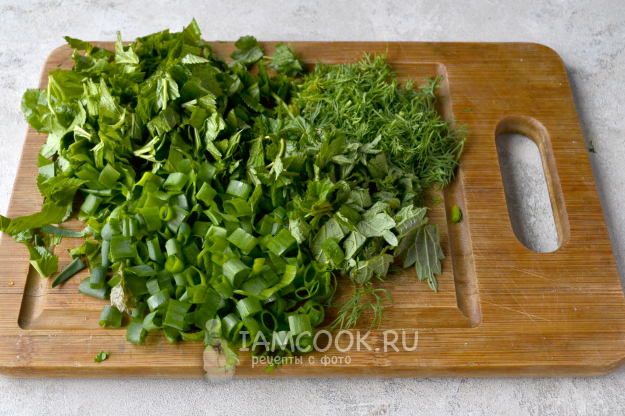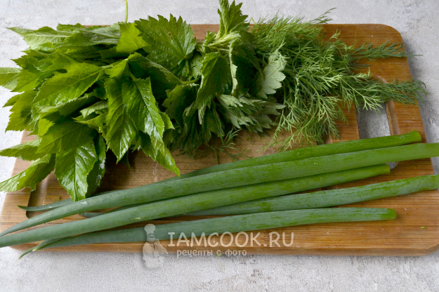 Всю зелень тщательно промойте в большом количестве воды и обсушите. Оторвите листочки у крапивы, стебли не понадобятся. У сныти тоже возьмите верхнюю часть без стебля.
