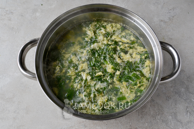 Как только суп с зеленью закипит, тонкой струйкой влейте в кастрюлю взболтанные яйца, при этом сразу же начните перемешивать суп, чтобы яйца сварились в виде хлопьев.