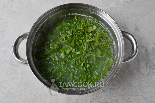 Когда картофель будет готов, опустите в кастрюлю нарезанную зелень и доведите суп до кипения.