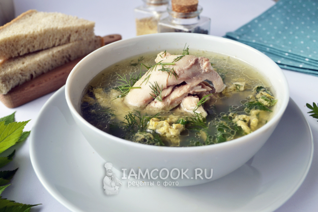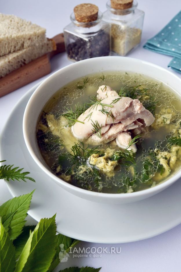 Суп с крапивой, снытью и яйцами на курином бульоне готов.