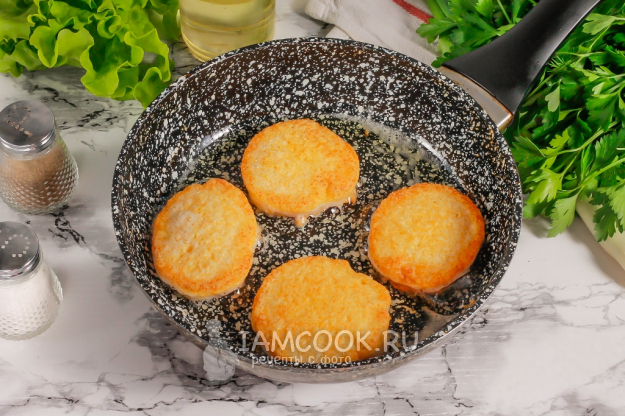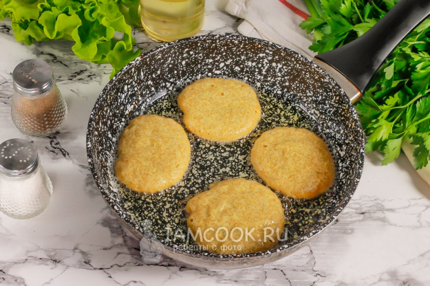 Прогрейте на сковороде половину растительного масла и выложите в него столовой ложкой икорное тесто. Убавьте нагрев до умеренного, так как котлеты очень быстро могут подгореть. Обжарьте на одной стороне примерно 2 минуты.