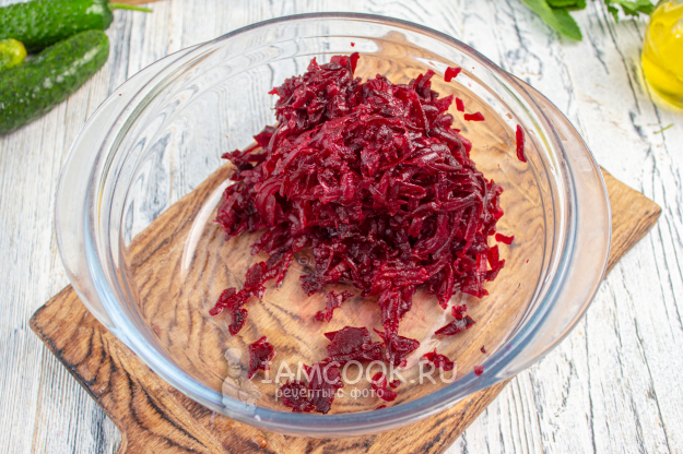 Я всегда запекаю свеклу, предварительно ее промыв и обсушив, - плотно заворачиваю в фольгу, запекаю при 200 градусах от 45 до 60 минут, в зависимости от ее размера. Запеченную свеклу очистите и натрите на терке.