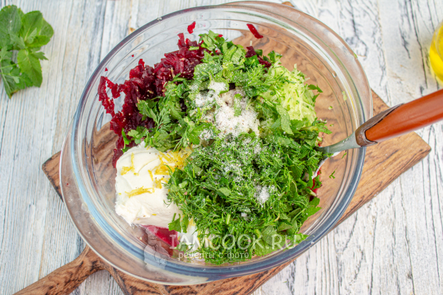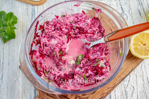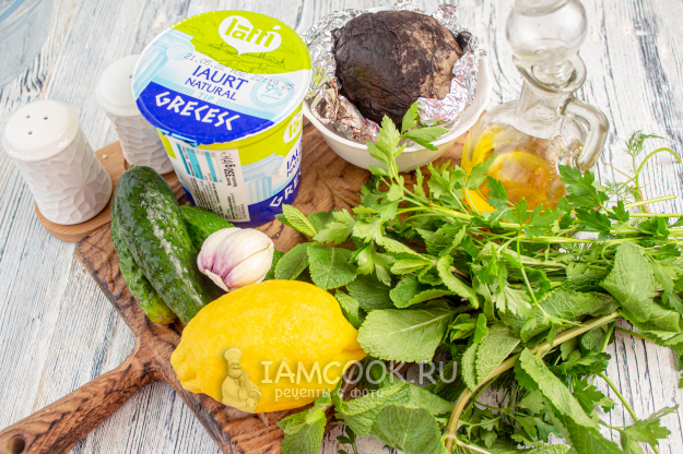 Приготовьте все необходимые ингредиенты для приготовления соуса Цацики со свеклой. Свеклу запеките накануне и дайте ей полностью остыть. По желанию, свеклу можно отварить, но запеченная менее водянистая и имеет более яркий и насыщенный цвет и вкус.