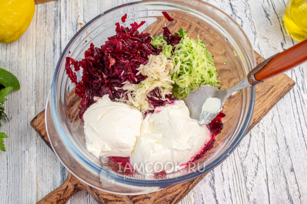 Молоденькие летние огурцы промойте, обсушите и натрите на мелкой терке, добавьте их к свекле. Сюда же натрите или пропустите через пресс чеснок, добавьте греческий натуральный йогурт без добавок.