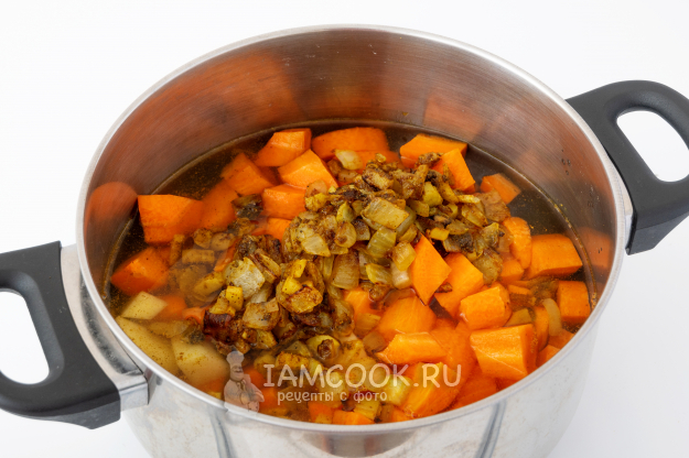 Следом отправьте жаренный лук со специями и влейте воду, так, чтобы она покрывала овощи. У меня вышло 600 мл. Варите овощи до готовности (ориентировочно минут 30). За минут 10 до конца приготовления посолите и поперчите суп по вкусу.
