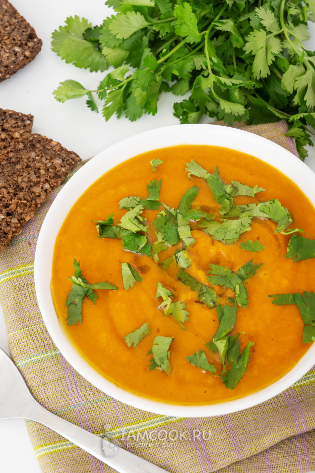 Постный морковно-имбирный суп-пюре готов! По желанию посыпьте суп кинзой и можно чуток полить сверху оливковым маслом.