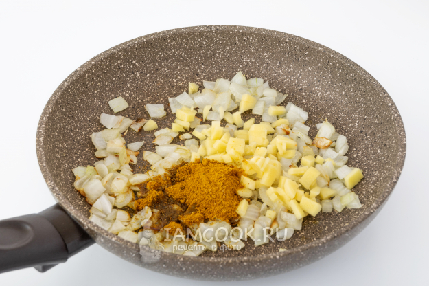 Когда лук слегка зарумянится, положите к нему приправу карри и нарезанный (или натёртый) имбирь. Перемешайте, подержите на огне 1-2 минутки и выключите огонь.