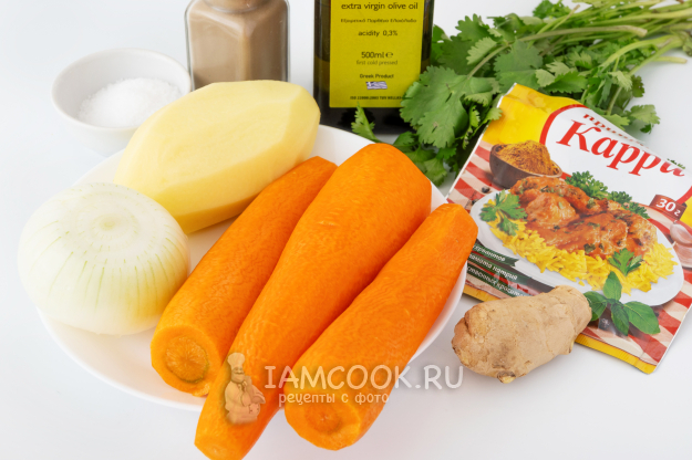 Для приготовления веганского морковно-имбирного супа-пюре возьмите необходимые продукты (смотрите список ингредиентов). Такой суп очень хорошо гармонирует с кинзой, поэтому при подаче она вам может пригодиться)))
