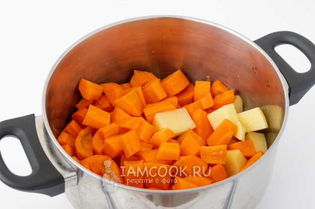 В кастрюлю положите нарезанные не очень крупно морковь и картофель.