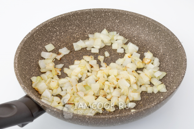Первым делом обжарьте на сковороде с оливковым маслом нарезанный лук.