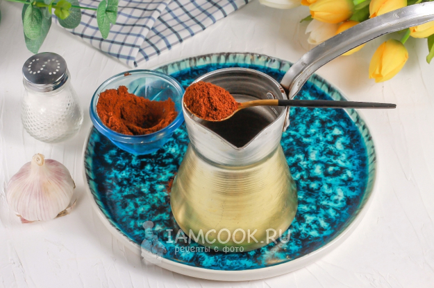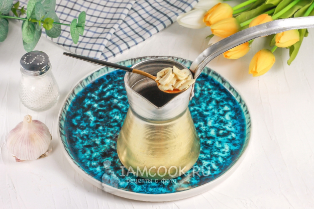 Очистите чесночные зубчики и промойте их. Либо раздавите ножом, либо нарежьте слайсами. Если чеснок свежий, то желательно разрезать каждый зубчик и вырезать зеленую сердцевинку - она придает напитку горьковатый травянистый привкус. Всыпьте нарезку чеснока в турку.