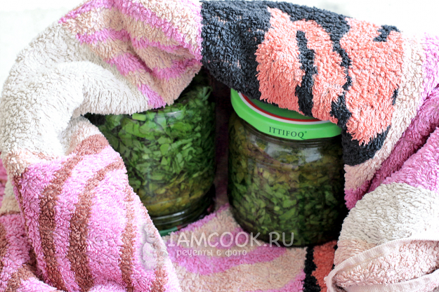 Через пять минут банки можно поставить вертикально, чтобы кипяток пропарил весь щавель. Баночки накройте чем-то теплым и оставьте до остывания и изменения цвета щавеля.