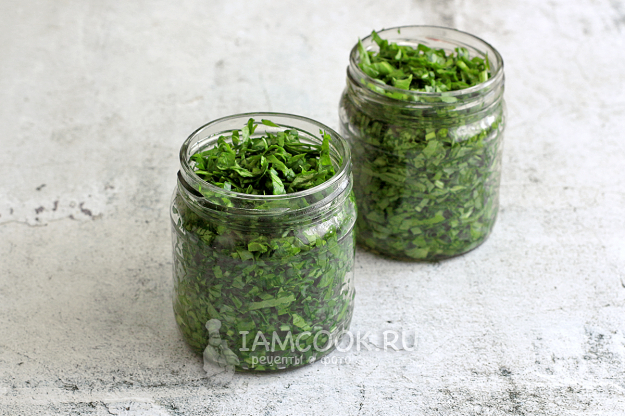 Уложите нарезанный щавель в банки, слегка его утрамбовывая. Оставляйте все же немного места, чтобы было куда затечь воде.