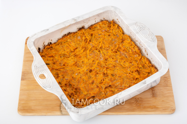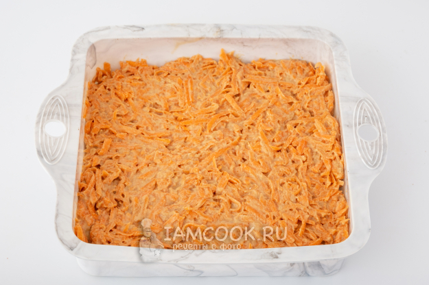 Выложите морковную массу в форму для выпечки. Если у вас силиконовая форма, то дополнительно смазывать форму не нужно. В противном случае, возможно, понадобиться смазать форму маслом.
