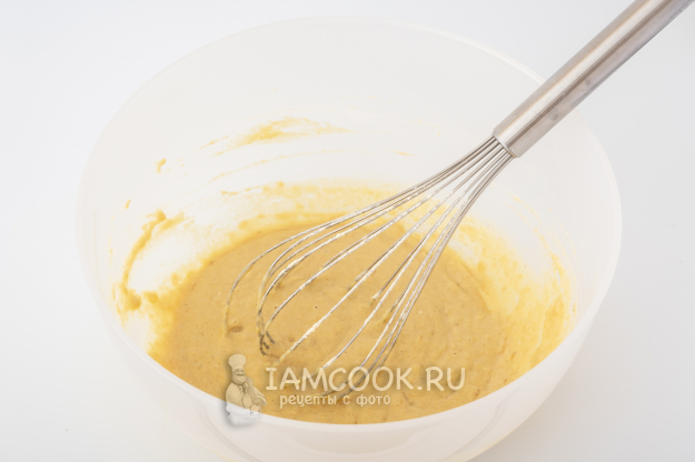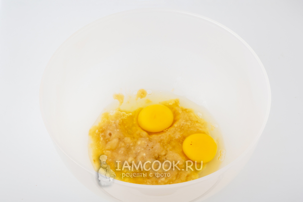 Разомните банан вилочкой до состояния пюре. А затем вбейте к банановому пюре 2 яйца и взбейте массу венчиком.