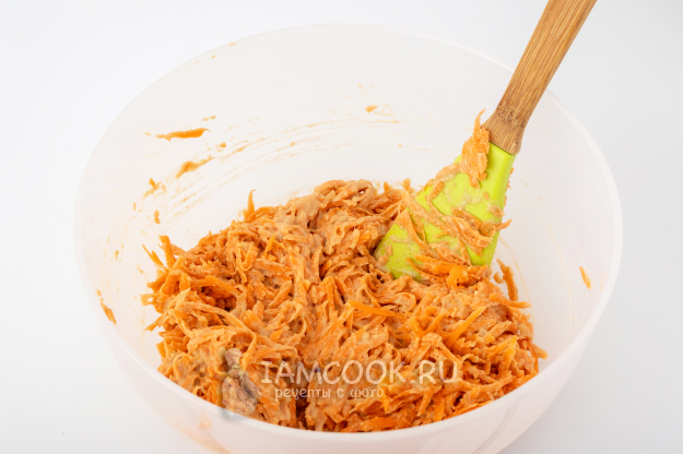 Морковь натрите на тёрке и вмешайте её в кукурузное тесто.