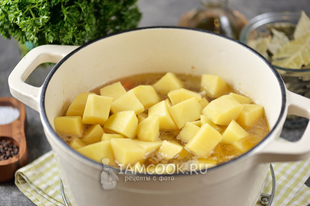 Нарежьте картофель крупным кубиком, переложите в казан, продолжайте варить шулюм еще 15 минут.