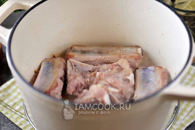 Влейте 1,5 литра воды, сделайте огонь под казаном тихим, варите ребра минут 20-30, вода должна еле кипеть.