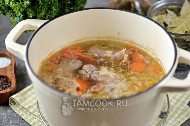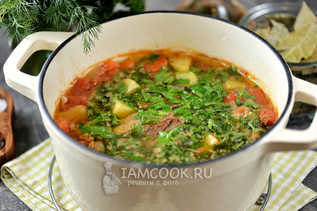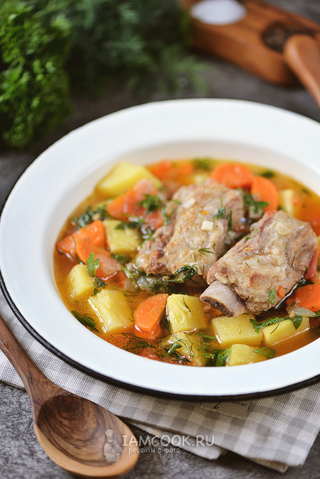 Разлейте готовый шулюм из свиных ребрышек по тарелкам и подавайте к столу.
