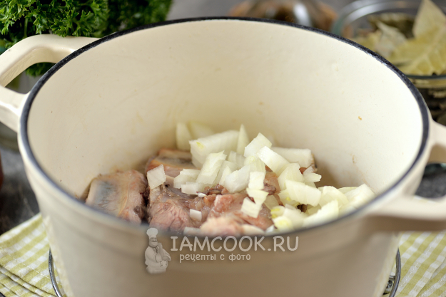 Добавьте нарезанный лук, жарьте с минуту вместе с ребрами.