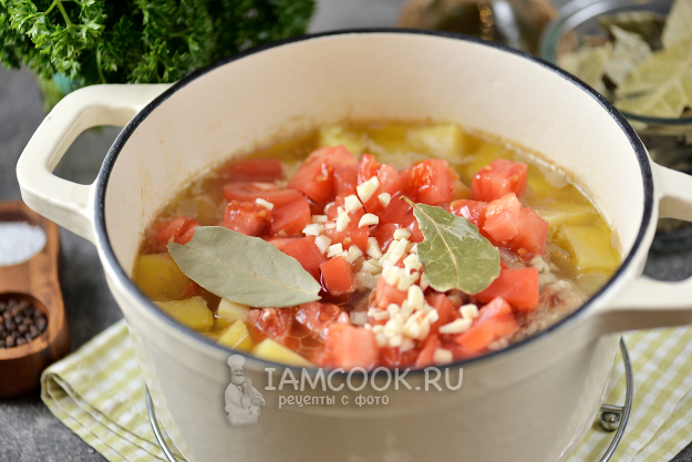 Проколите картошку ножом, она должна быть почти готовой. Теперь добавьте в казан нарезанные мясистые помидоры, измельченный чеснок и лавровый лист. Аккуратно перемешайте содержимое казана, варите на умеренном огне 10 минут.