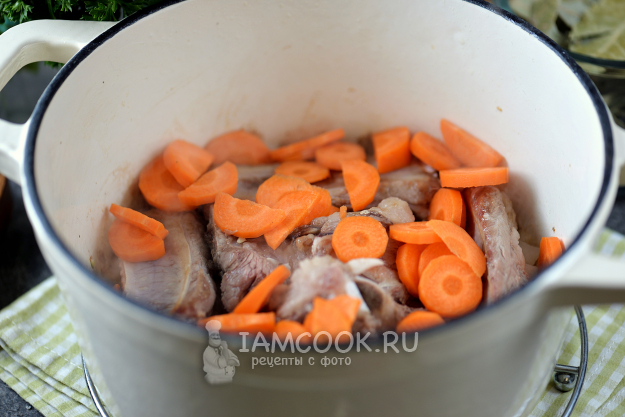 Теперь переложите в казан нарезанную тонкими ломтиками морковь, также обжарьте с минуту, помешивая лопаткой.