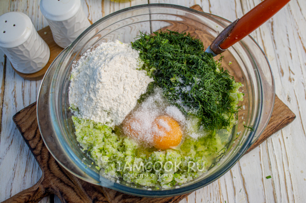 Перемешайте массу, чтобы получилось тесто как на оладьи.