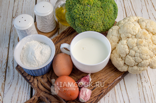 Возьмите все необходимые ингредиенты для приготовления оладий из брокколи и цветной капусты.