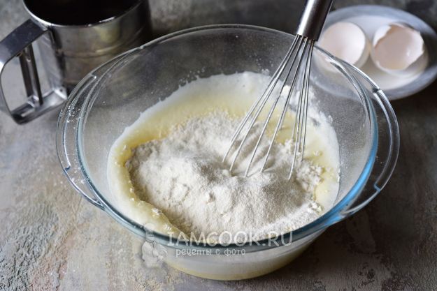 Добавим оставшуюся сухую мучную смесь и перемешаем до получения однородного вязкого теста, консистенция которого похожа на консистенцию сметаны средней жирности.
