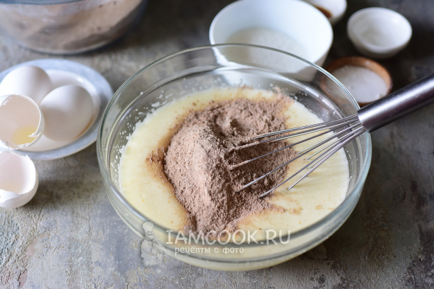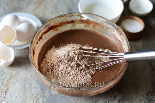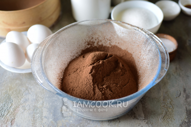 Сначала приготовим шоколадный бисквит. В миску просеем всю муку и какао.
