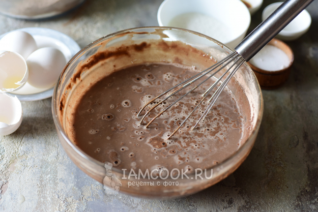 Половину сухой смеси добавим к жидкой смеси и венчиком перемешаем до получения однородной массы.