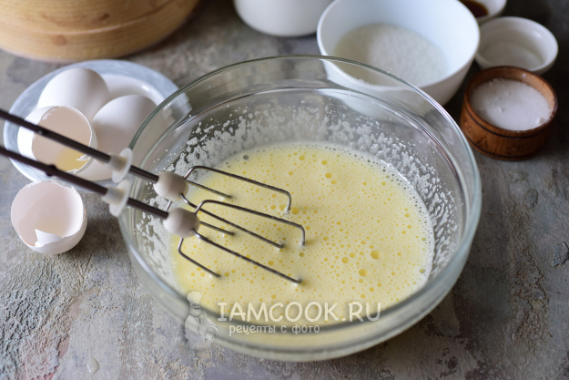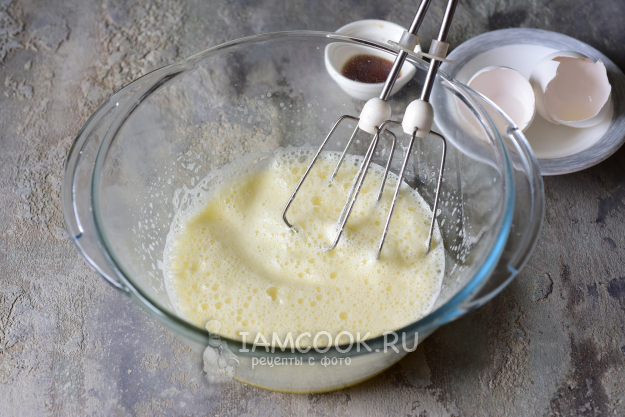 Будем взбивать миксером эти ингредиенты до пышной светлой пены.