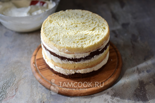 Поверх ванильного бисквита выкладываем 200 г крема, разравниваем лопаткой и сверху кладем шоколадный бисквит, немного вдавливая, тем самым равномерно распределяя крем. Поверх шоколадного бисквита выкладываем 200 г крема и вновь лопаткой распределяем равномерно.